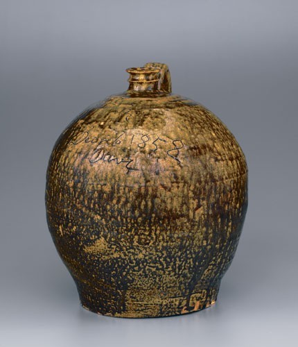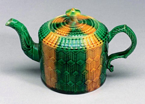 Ceramic man woman form green arms legs run together.