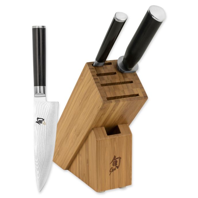 There are only three knives a 6 inch chef knife a 4 inch utility knife and a 3 inch paring knife but they look at lot sleeker than most of the cheaper ceramic knives.